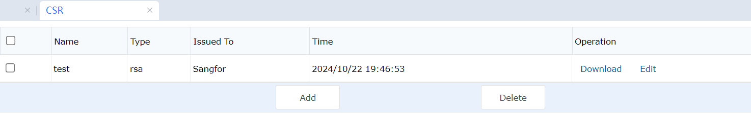After parameters are configured and submitted, a certificate application and key files will be generated. Click Download to download the application file, which is a CSR file.
