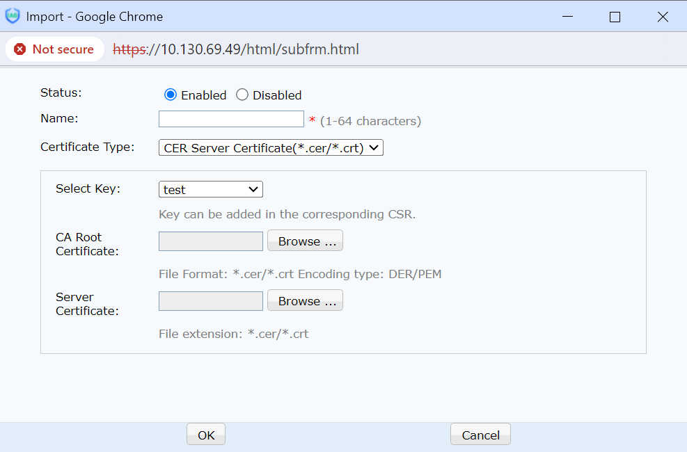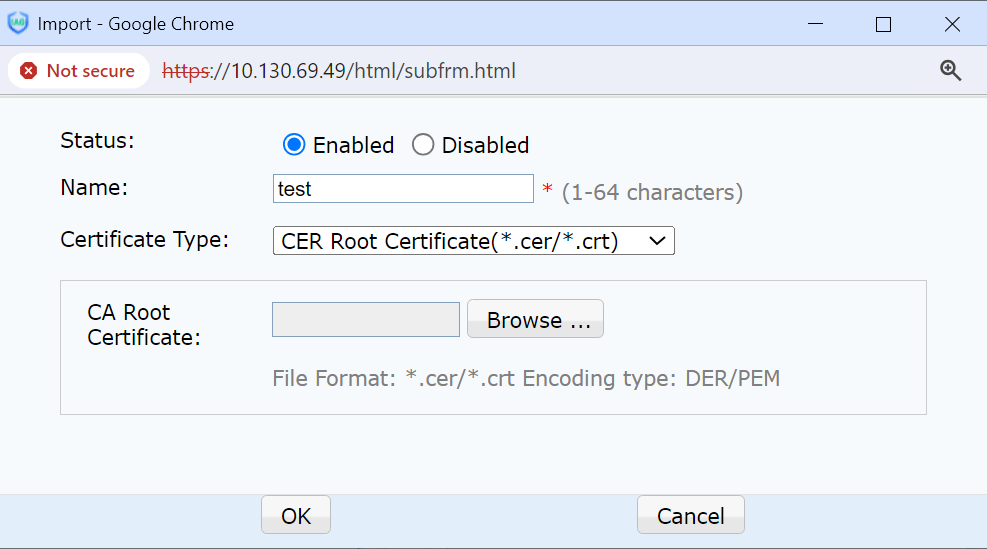 CA Root certificate: Import the applied CA root certificate.