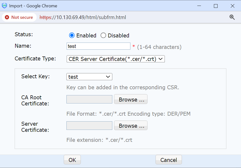Local Certificate: Import the generated certificate.