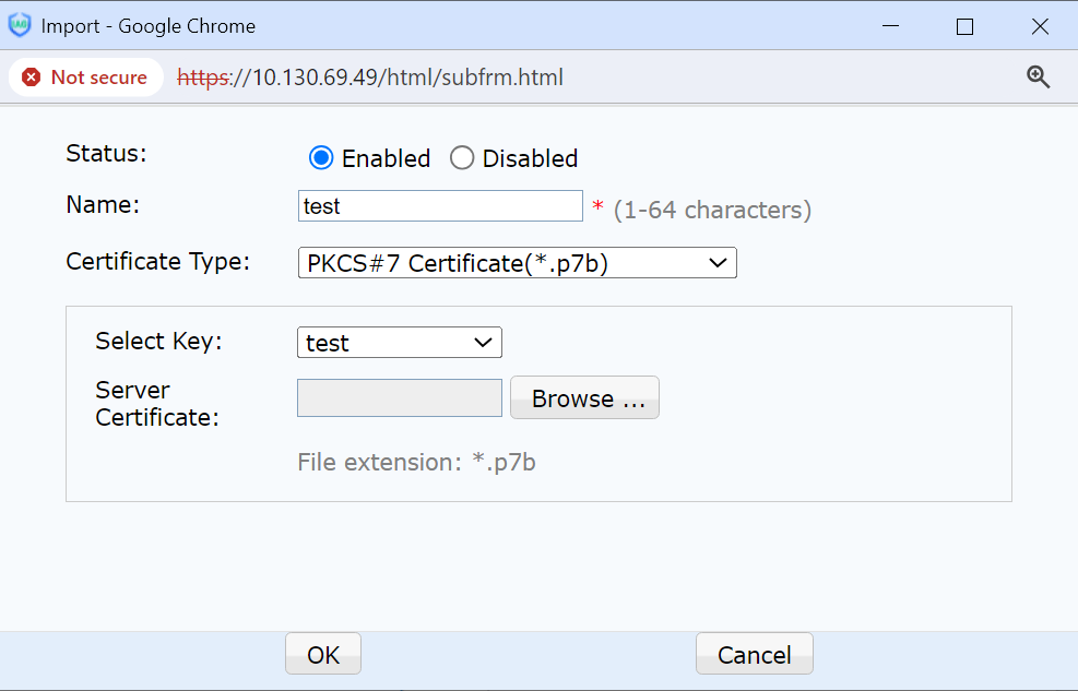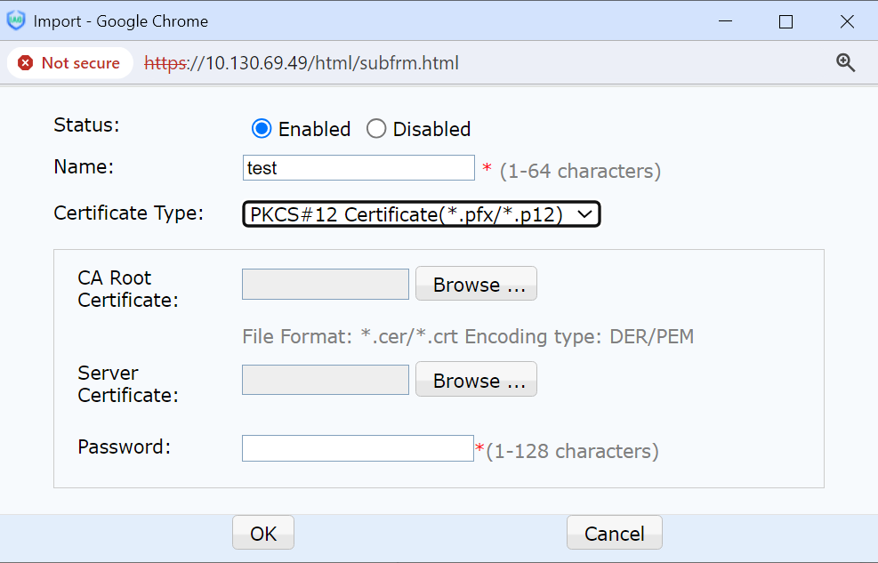 Local Certificate: Import a certificate in P12 format.