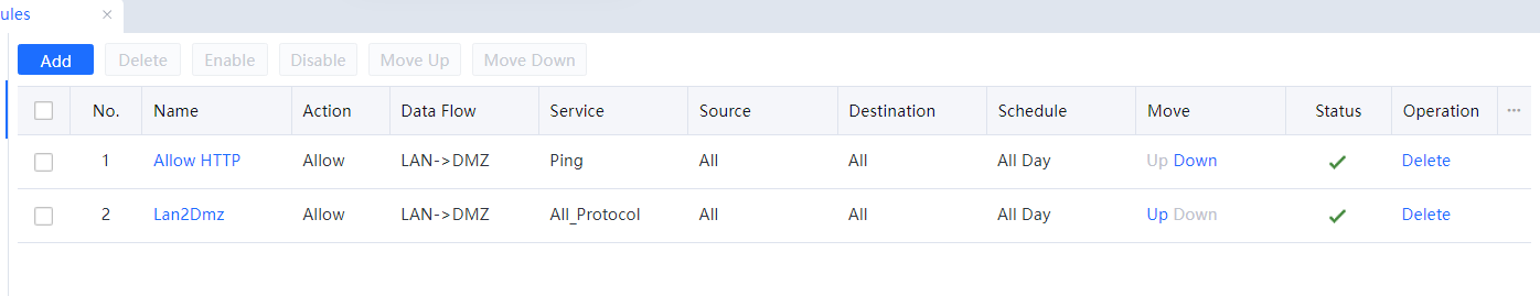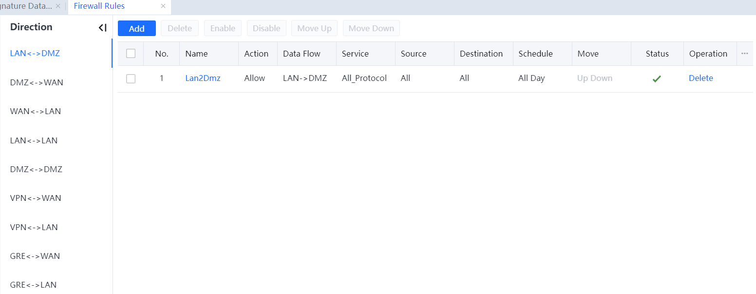 For example, internal web servers are connected to the device's demilitarized zone (DMZ), and common internal users are connected to the local area network (LAN) zone. For server security purposes, users in the LAN zone can access only Transmission Control Protocol (TCP) port 80 (web service) of the servers in the DMZ, and other data is not allowed to be forwarded to the DMZ. In this case, Firewall Rules between the LAN zone and DMZ need to be set. The procedure is as follows: