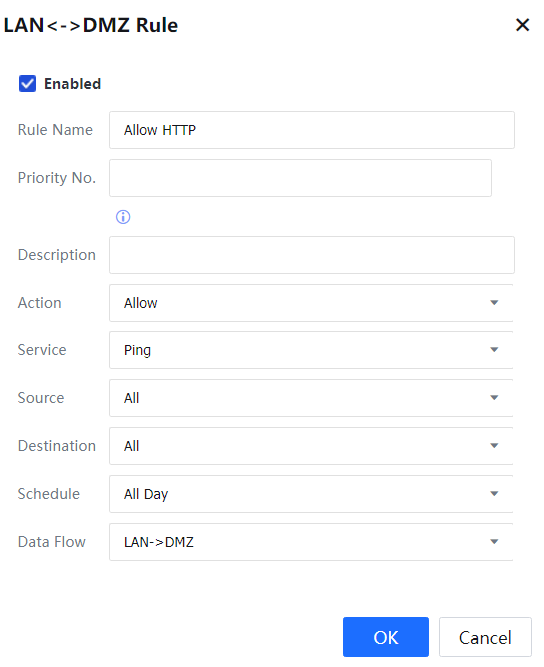 Set a rule to allow HTTP packets from the LAN zone to the DMZ. Specifically, select Allow from Action, HTTP from Service, and All from Source and Destination, or enter an IP group. Select All Day from Schedule and specify a period. Select LAN > DMZ from Data Flow. See the following figure.