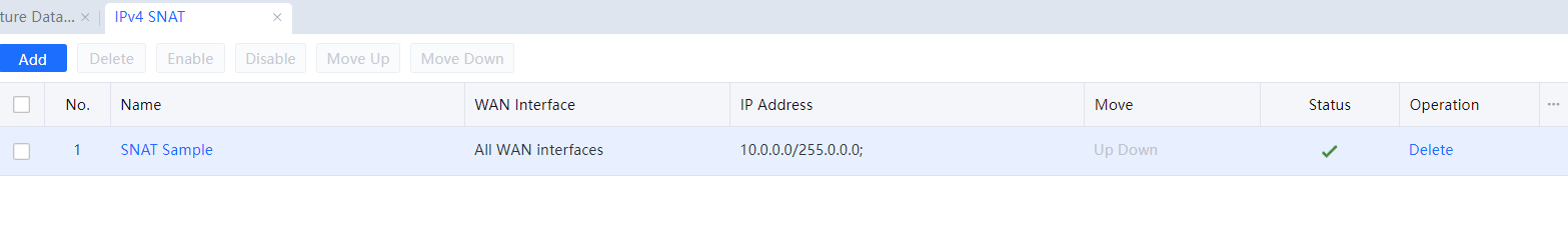 Modify the IPv4 SNAT rule if required. Select the rule and click Delete to delete the rule. Click Enable to enable the rule. Click Disable to disable the rule. Click Move Up or Move Down to change the priority of the rule. To edit a rule, click the rule's name and then edit the rule in the displayed dialog box.