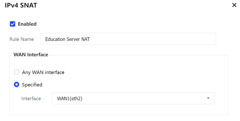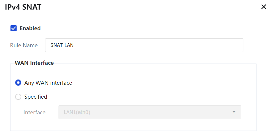 On IPv4 SNAT, click Add. In the dialog box shown in the following figure, select Enabled and enter a rule name in Name.