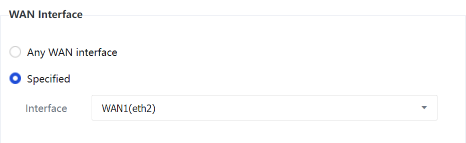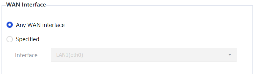 In the WAN interface, set a WAN interface used for data forwarding. In this example, address translation is performed for data forwarded over WAN1. Therefore, select WAN1 from Interface.