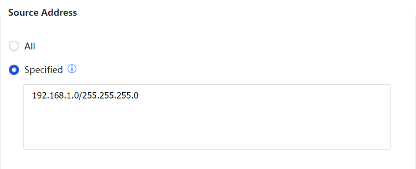 In Source Address, set the source IP address for SNAT. In this example, the network segment is 192.168.1.0/255.255.255.0. Therefore, select Specified and set the source IP address segment.
