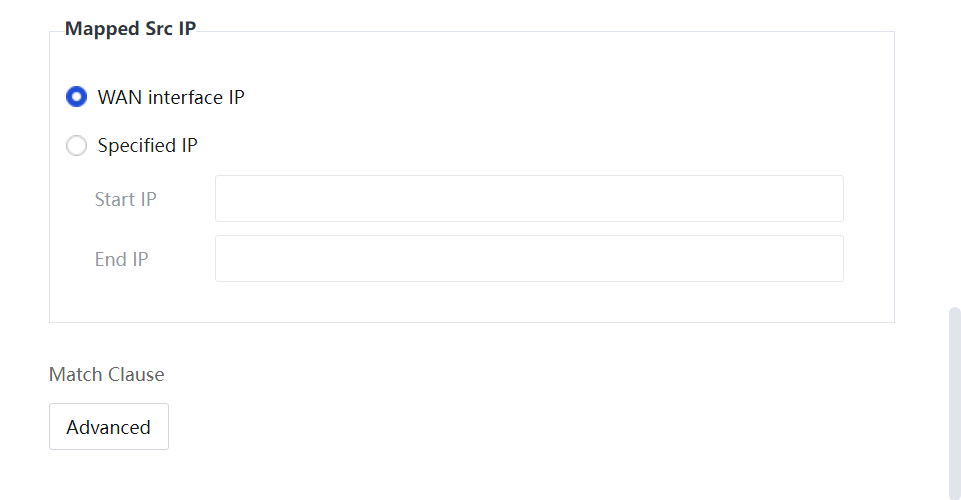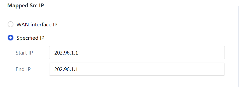 In Mapped Src IP, set the range of IP addresses to which source IP addresses of data meeting the conditions are translated. If WAN interface IP is selected, source IP addresses will be translated into the IP address of the WAN interface specified in Step 2. If Specified IP is selected, source IP addresses will be translated into the specified IP addresses.