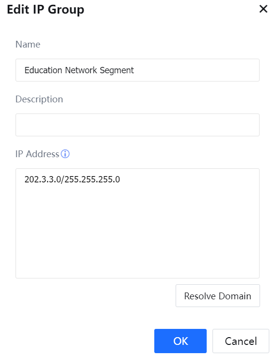 Add two IP groups: the education network segment and the internal network segment. The following figure shows an example of defining the IP group Education Network Segment.