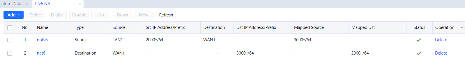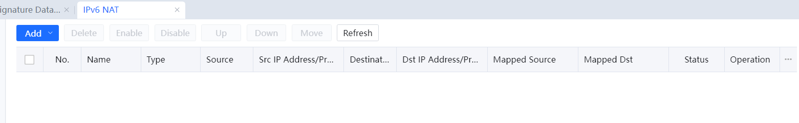 You can manage source IPv6 NAT rules, including adding and deleting rules. See the following figure.