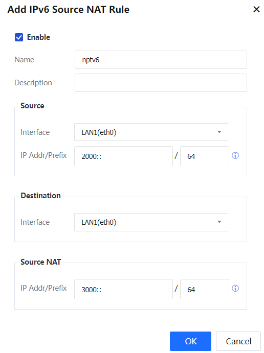 Source: Select an internal network interface of the source zone from Interface and enter the prefix of an internal IPv6 address in IP Addr/Prefix, for example, 2000::/64.