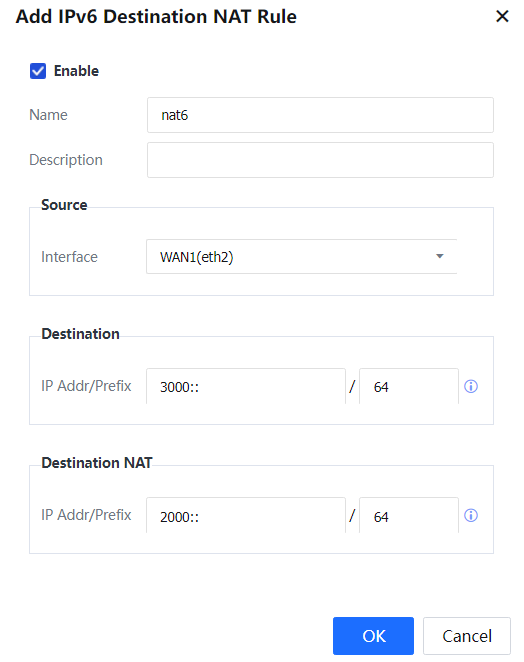 Source: Select a WAN interface of the source zone from Interface and enter the prefix of an internal IPv6 address in IP Addr/Prefix, for example, 3000::/64.