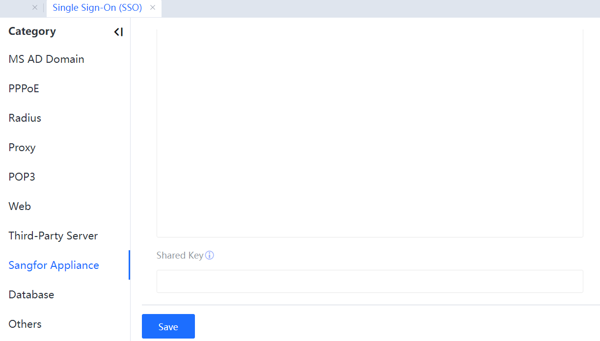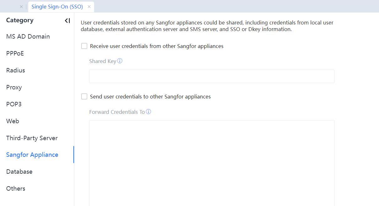 For device configuration, go to Access Mgt > Authentication > Web Authentication > Single Sign-On (SSO) > Sangfor Appliance, and configure the forwarding policy and shared key in Send user credentials to other Sangfor appliances.