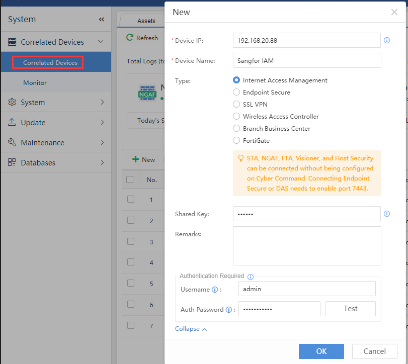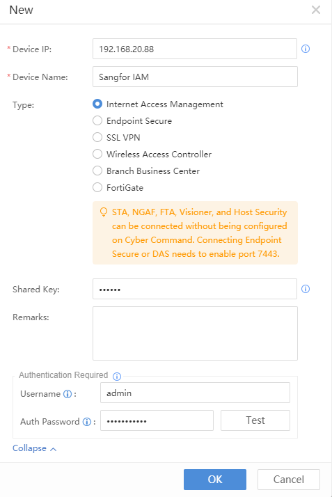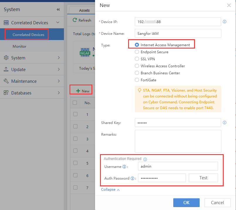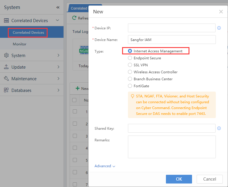 In the Cyber Command console, go to System Config > Device Management > New to add a new Internet access control device by configuring the IAG IP and shared secret key for the correlated device. There is no need to configure advanced options.[A332]