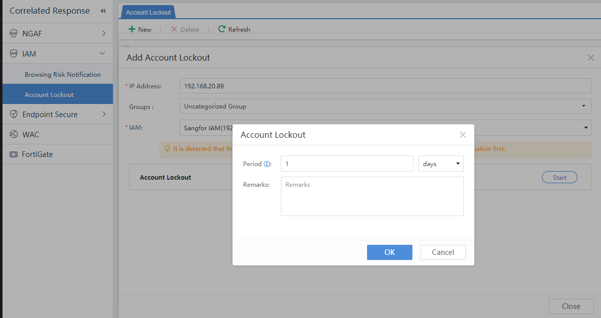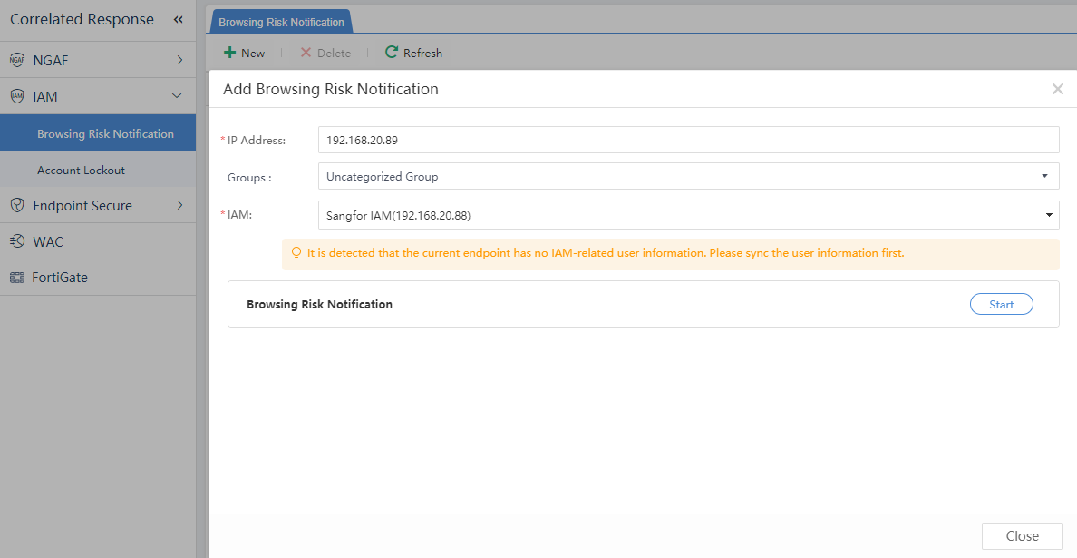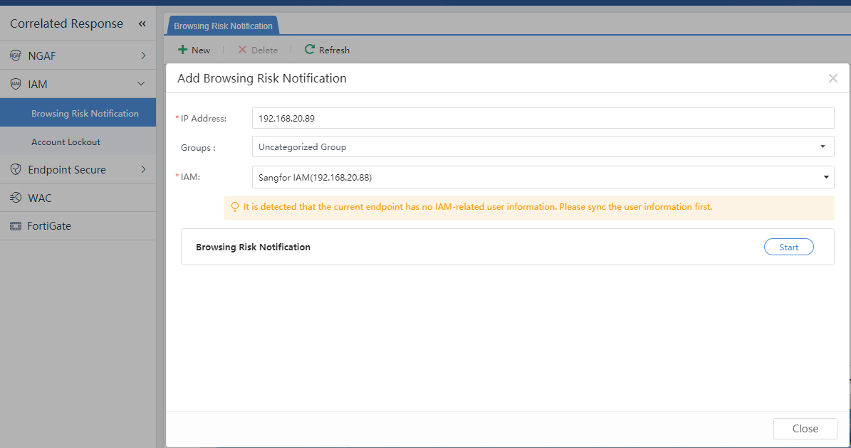 On the risky endpoint page, click a single IP address to correlate or click More > Correlated Response > correlated IAG interface to add a new device. The prompt message of Internet access prompting can use the system recommendation or be customized. The interface is shown below: