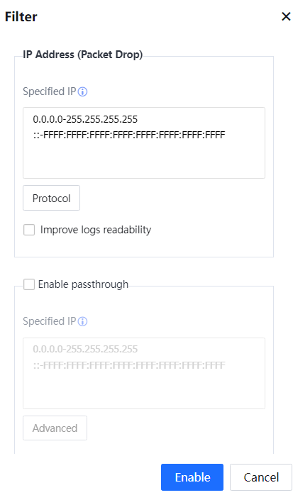 Specified IP: Specifies an IP address enabling the rejection list. By default, the rejection list applies to all network segments. Click Protocol and set the protocol type and port range for filtering interception logs, as shown in the following figure.