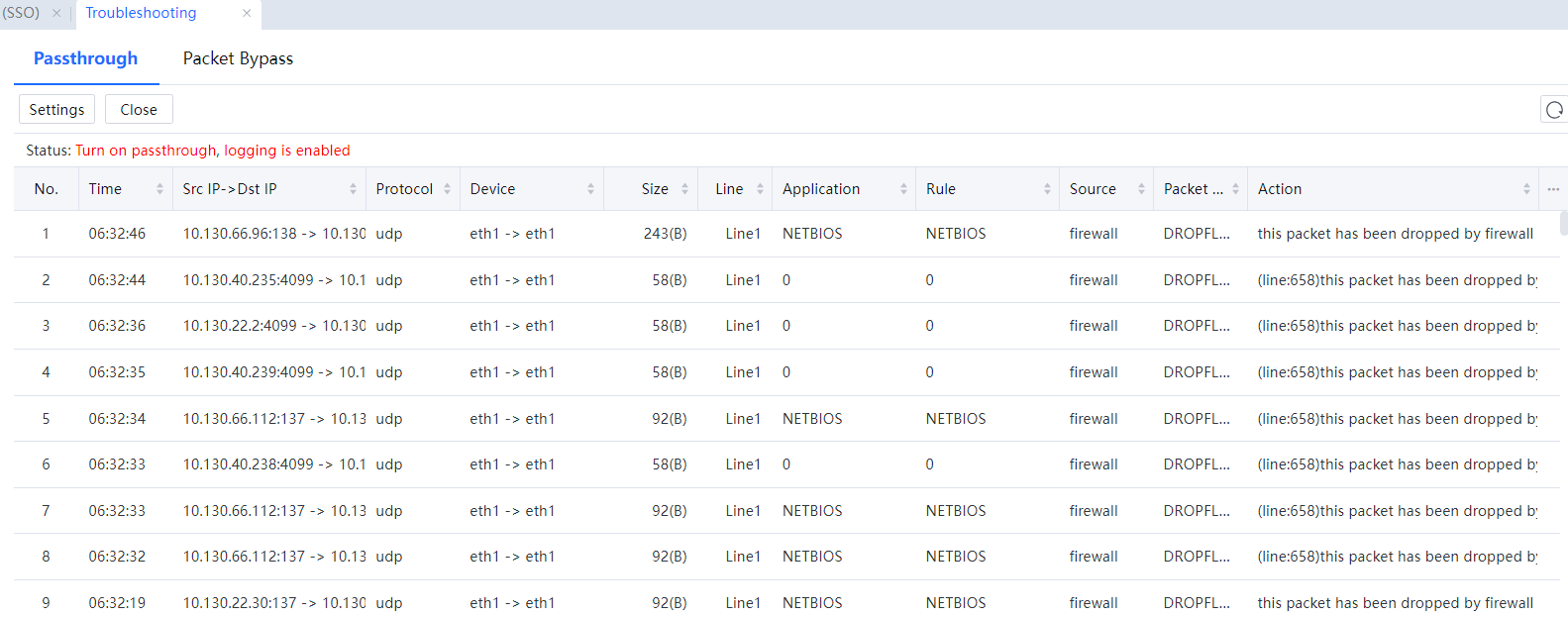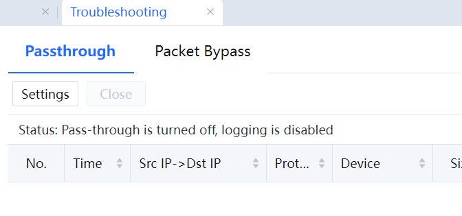 After the interception logging and pass-through transmission functions are enabled, if the administrator does not manually click Close, these functions are still enabled even if the device is restarted.