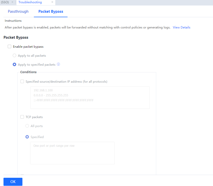 1. After packet bypass is enabled, the Internet access traffic will be forwarded without being controlled by the policies, such as user authentication, access control, bandwidth control, and Internet access audit policies.