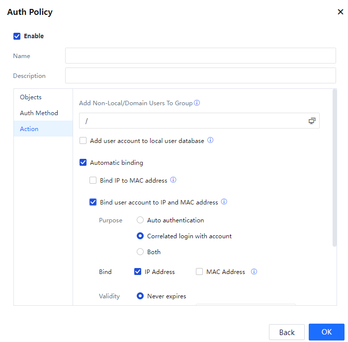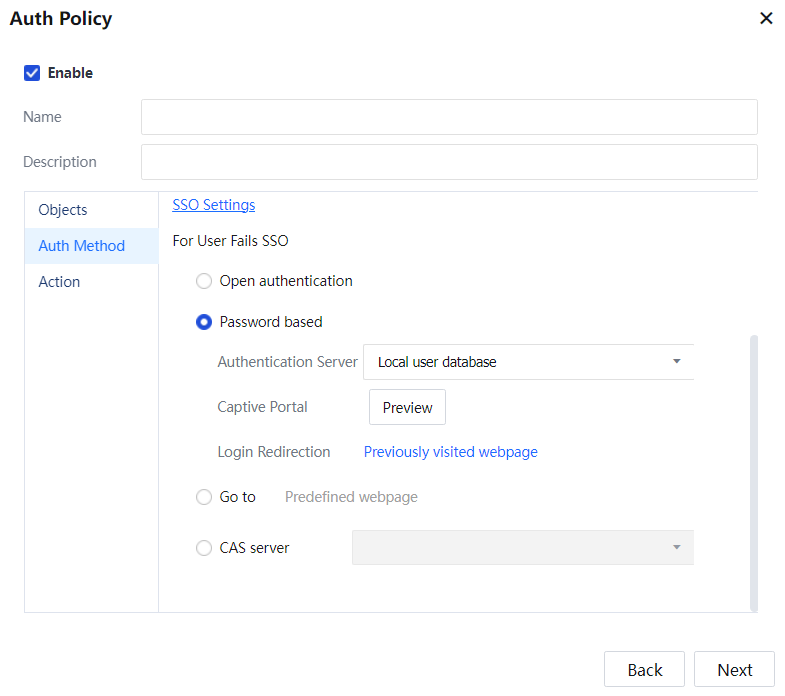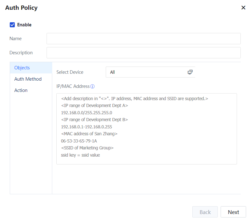Step 2.Set the authentication policy. Choose Access Mgt > Authentication > Web Authentication > Authentication Policy. Set the authentication policy according to the IP or MAC addresses of the users who require SSO.
