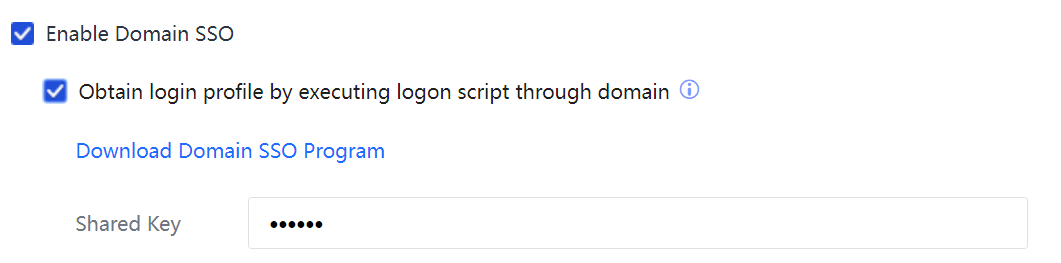 The shared key is used to encrypt the communication between the device and the AD domain server and must be specified exactly the same in the login script. Click Download Domain SSO Program to download the login and logout scripts.
