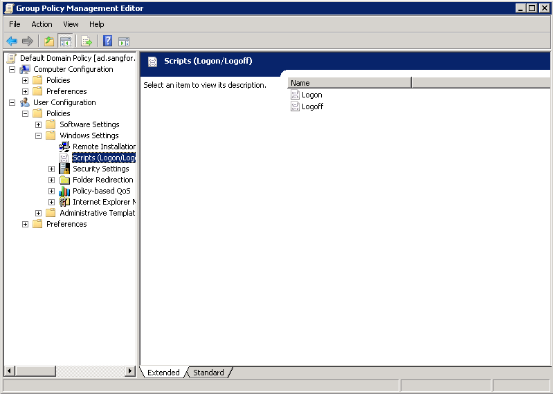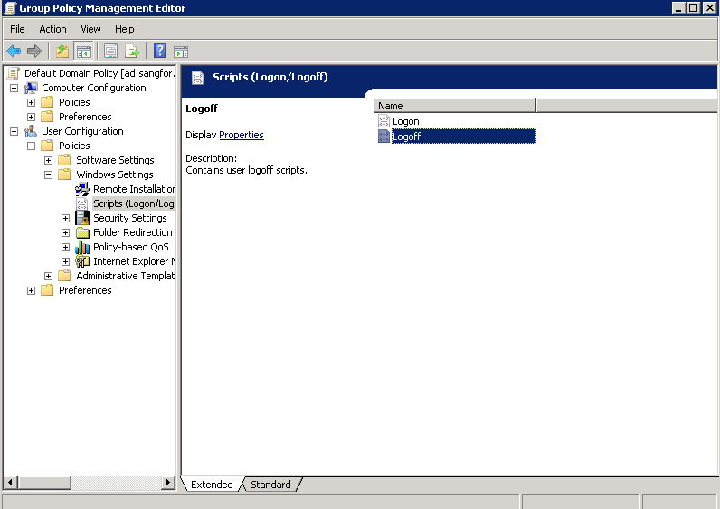 - In the displayed Group Policy Object Editor window, choose User Configuration > Windows Settings > Scripts (Logon/Logoff).