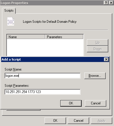 - In the Logon Properties window, click Add. In the Add a Script window, click Browse, choose the login script file logon.exe, and enter the IP address of the device, port number (fixed to 1773 and 1775 for IPv4, or to 1775 for IPv6), and shared key (exactly the same as that configured on the device). The parameter values must be separated by space. Click Apply and then OK. Then close the windows one by one.