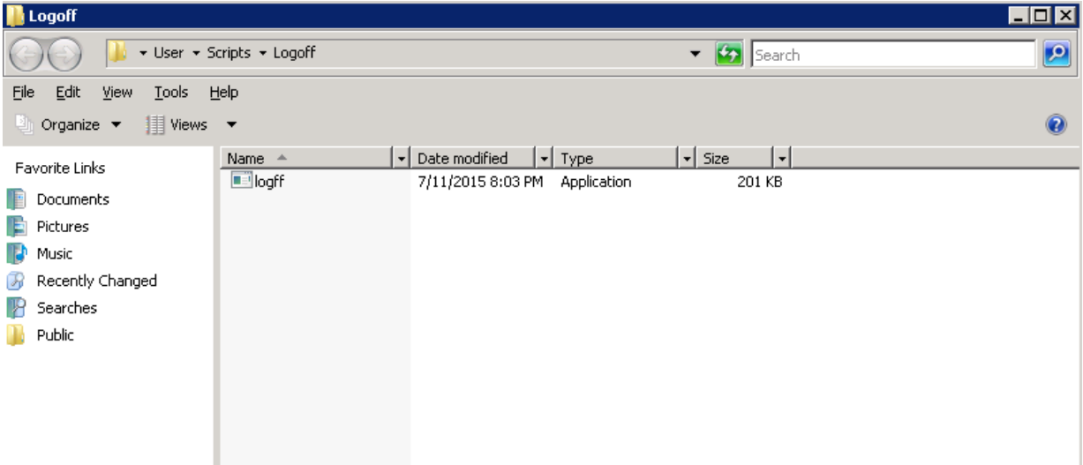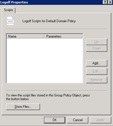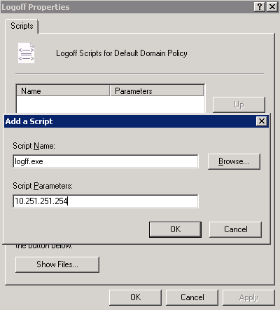 - In the displayed Logoff Properties window, click Show Files in the lower-left corner. A directory is opened. Save the logout script file logff.exe in the directory and close it.