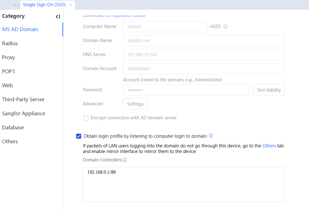 Step 2.Enable SSO on the device and set the IP address of the domain server. Navigate to Access Mgt > Authentication > Web Authentication > Single Sing-On(SSO) > MS AD Domain and perform configuration.