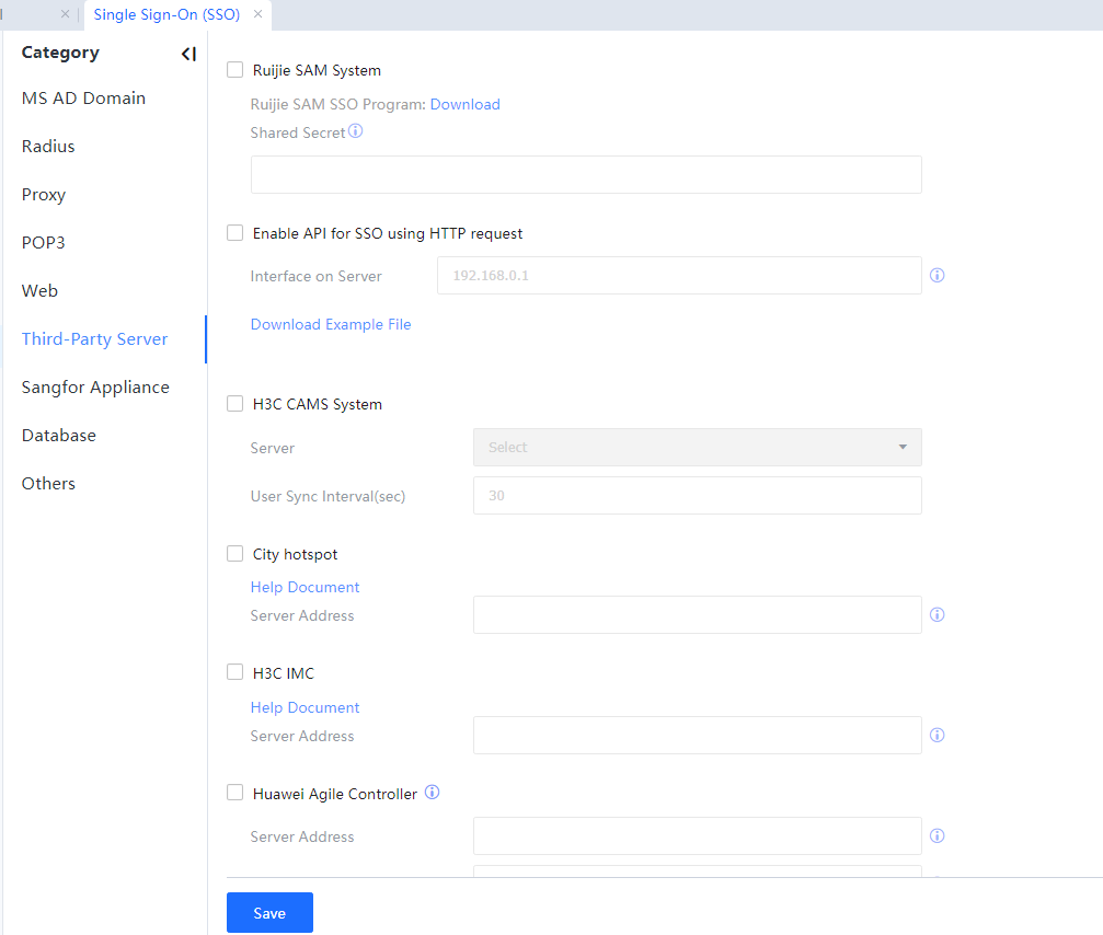 Step 2.Choose Access Mgt > Authentication > Web Authentication > Single Sign On SSO > Third-Party Server and perform configuration. Select Ruijie SAM system and configure the shared key. See the following figure.