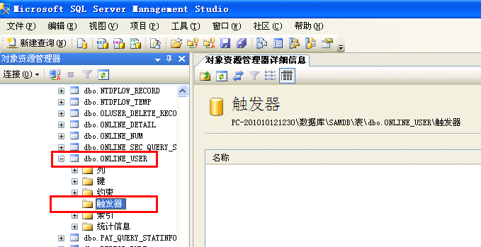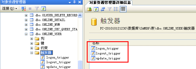 - Locate the ONLINE_USER table and click the trigger directory icon. No entry is displayed on the Object Resource Manager Details tab page on the right. No trigger has been created for the ONLINE_USER table. See the following figure.