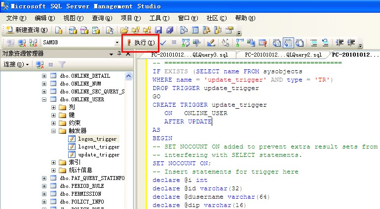 - Open the 2005 directory and double-click the three files described in step 3. They have opened in SQL Server 2005 Management Studio. Click Run on the toolbar. The trigger corresponding to the active tab page is installed. Go to the other two tab pages and perform the same operations to install the triggers.