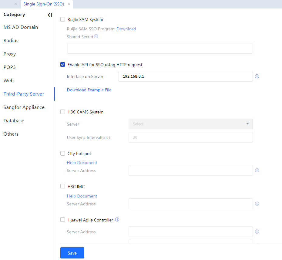 Step 2.Choose Access Mgt > Authentication > Web Authentication > Single Sign On SSO > Third-Party Server and perform configuration.