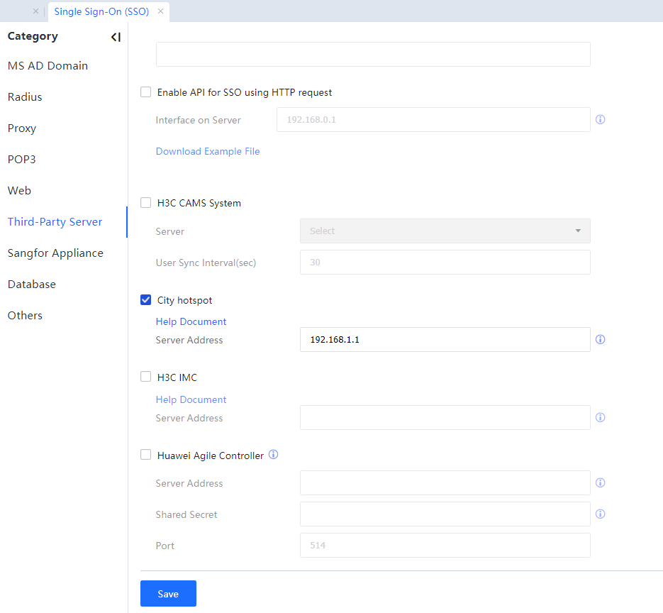 Step 2.Choose Access Mgt > Authentication > Web Authentication > Single Sign On SSO > Third-Party Server and perform configuration. Select City hotspot and set its IP address. See the following figure.