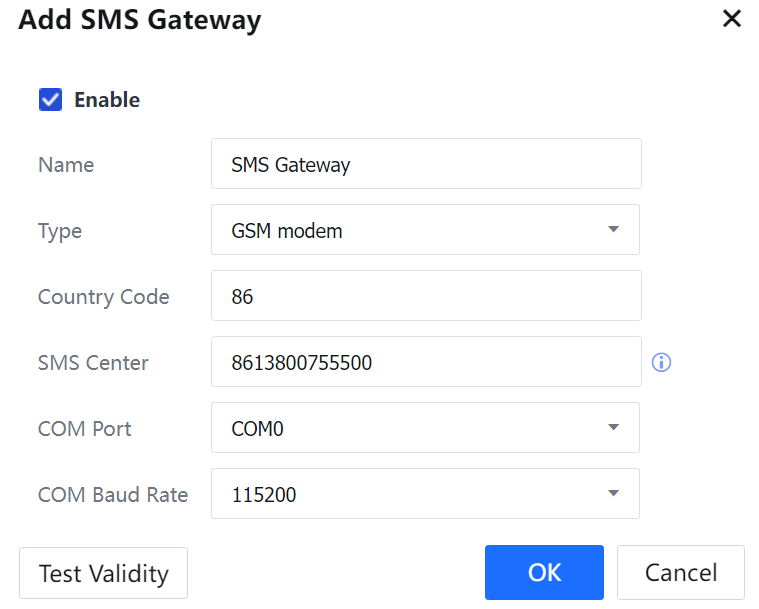 Step 3.Navigate to System > General > Advanced > Notification > SMS Notification and click Add to set SMS notification server: