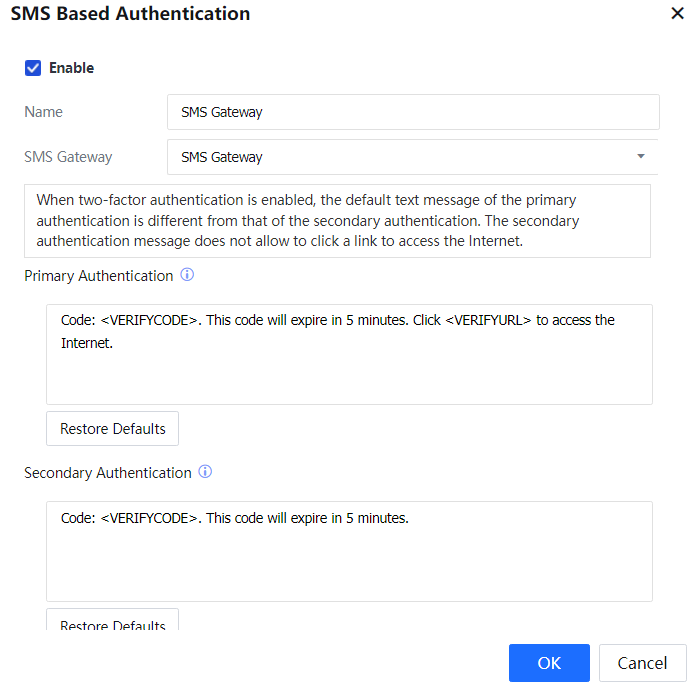 Set Authentication Server to Local Users and SMS Authentication.