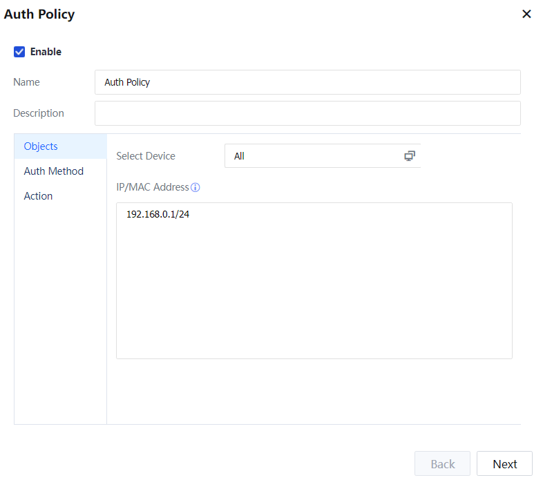Step 4.Navigate to Access Mgt > Authentication > Web Authentication > Authentication Policy > Add and enable SMS authentication. Set IP address/MAC address. In this example, set 192.168.1.0/24.
