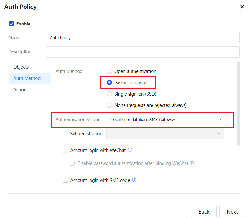Enable the configured SMS platform in Navigate to Access Mgt > Authentication > Web Authentication > Auth Server > Add > SMS Based Authentication: