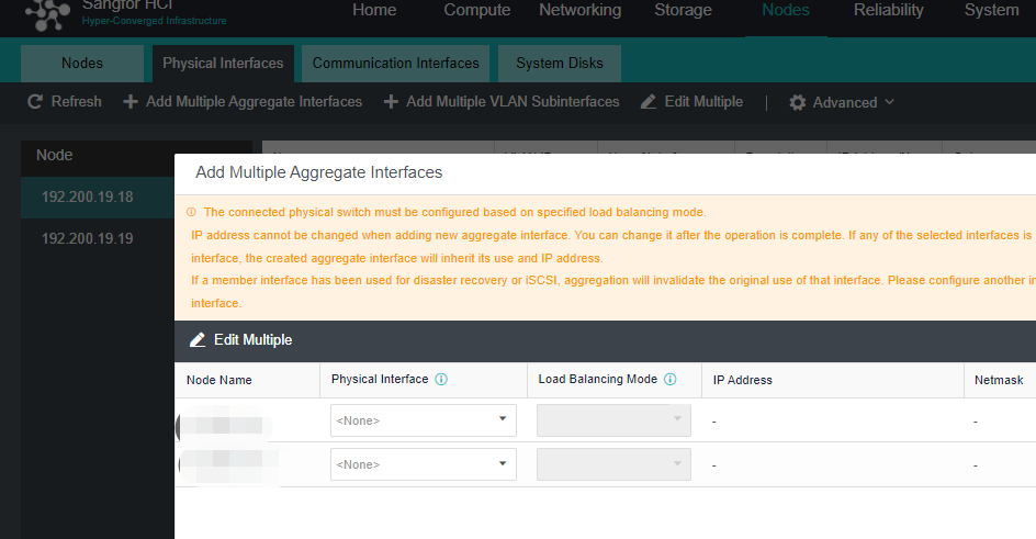 Click Nodes > Physical Interface on the HCI console, click Add Multiple Aggregate Interfaces, and select two interfaces. The aggregation mode recommends loading according to MAC or IP address.