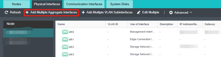 Click Nodes > Physical Interface on the HCI console, click Add Multiple Aggregate Interfaces, and select two interfaces. The aggregation mode recommends loading according to MAC or IP address.