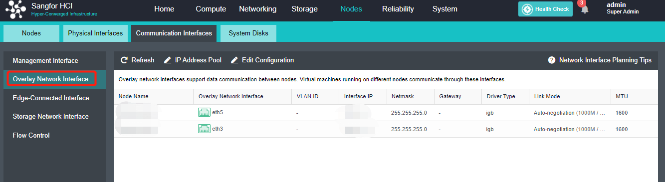 Click Nodes > Communication Interface in the HCI console. Find the Overlay Network Interface among the four interface roles and click Edit Configuration to enter the configuration page to modify the Overlay Network Interface.