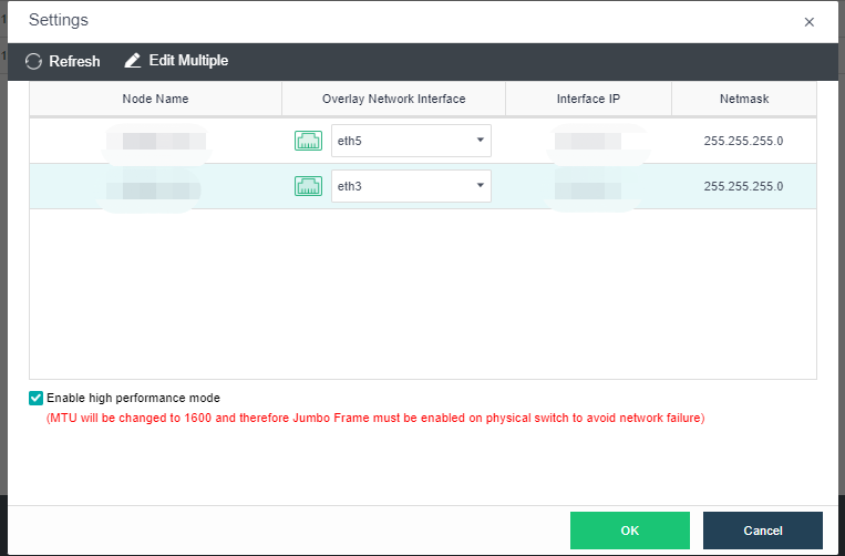 The Overlay Network Interface is configured as a multiplex cluster management port by default. To obtain high network forwarding performance, it is recommended to set the management communication port and Overlay Network Interface (VXLAN) to different interfaces.
