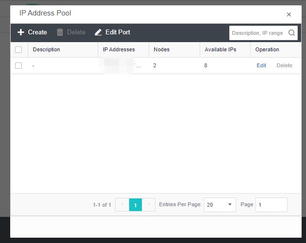 • Create: a VXLAN IP pool can be created. Multiple VXLAN IP pools can exist in a cluster. A node is only allowed to join one VXLAN IP pool.