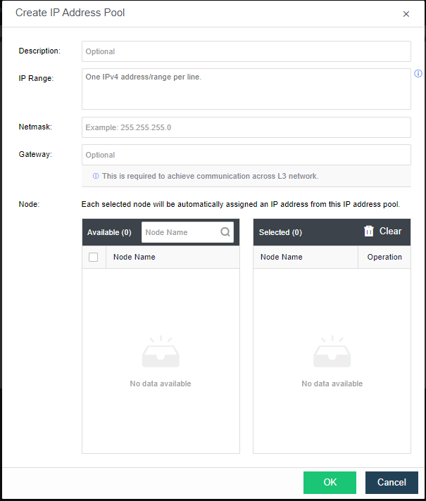 Click Create to configure the address. Enter the IP pool where the VXLAN IP is located and the netmask. The IP range must be greater than or equal to the number of nodes.