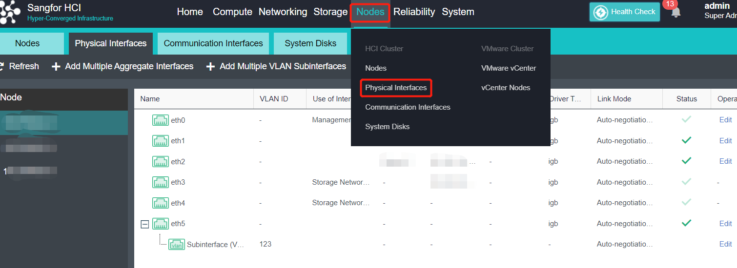 Click Nodes > Physical Interfaces on the console.