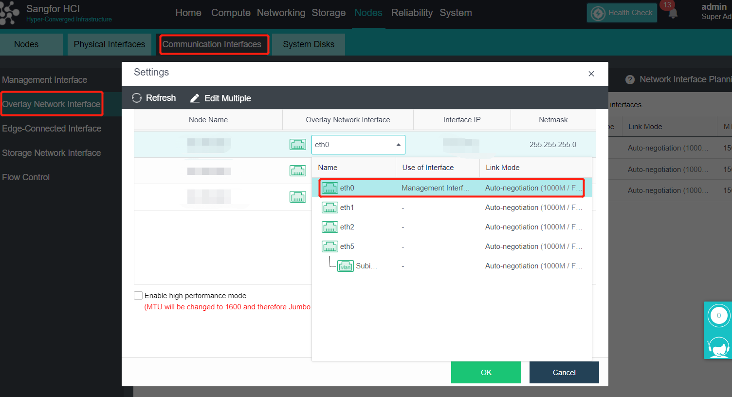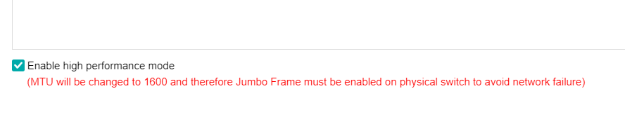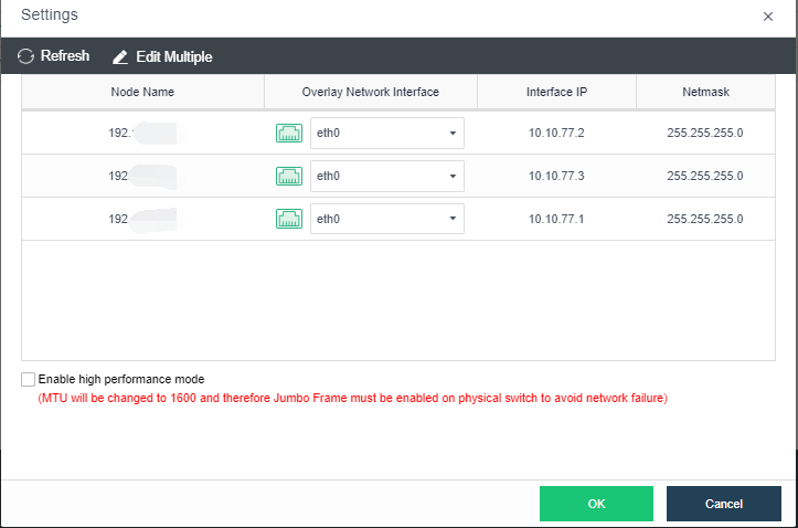 After all node interfaces are adjusted, click OK. Check the Enable high performance mode checkbox (this operation will set the MTU of the network port to 1600. You need to enable jumbo frame support on the physical switch. Otherwise, the network will be blocked).