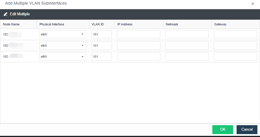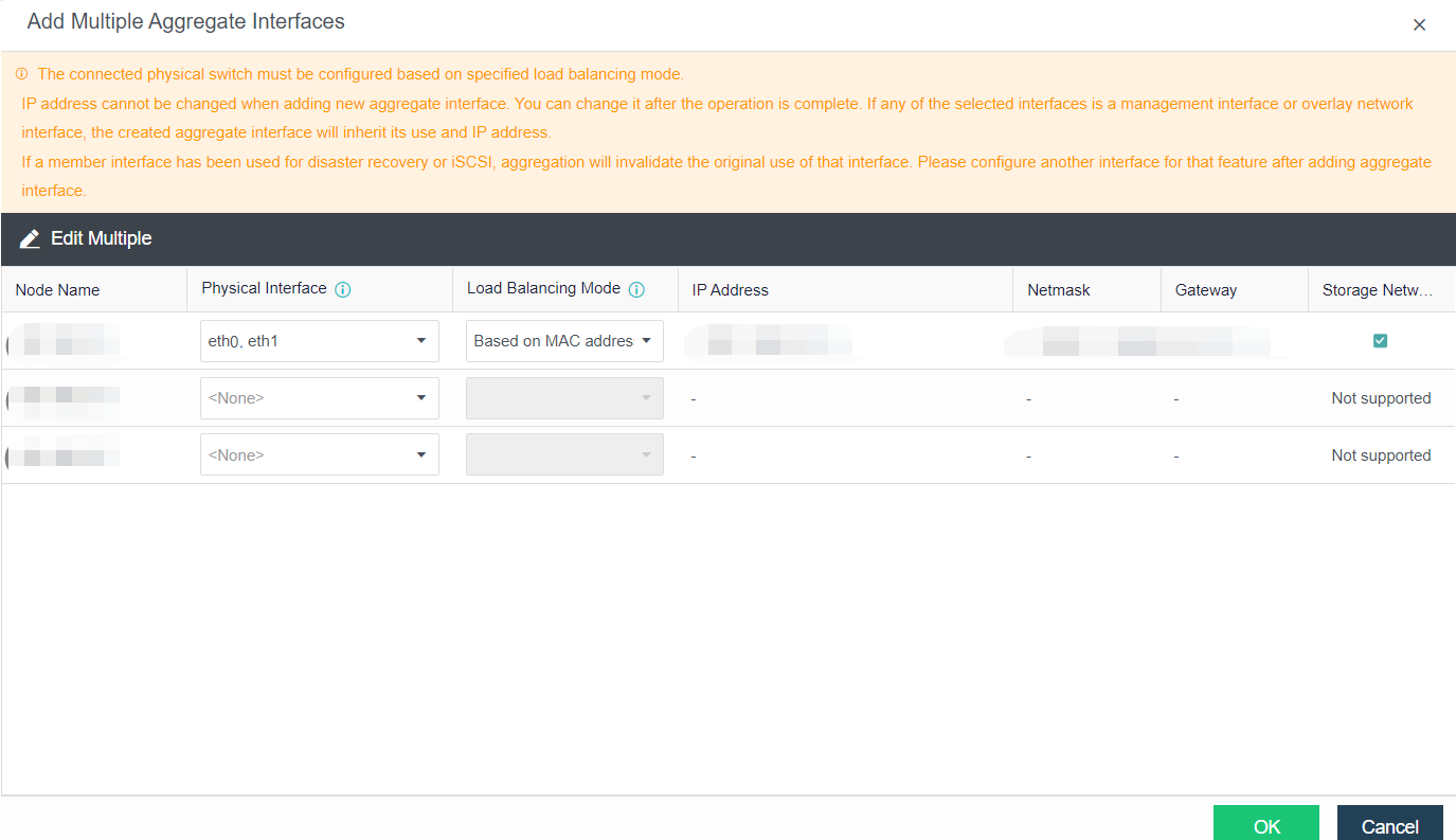 Click OK to bulk add the aggregation interface of the node. Please ensure that the IP address and VLAN ID are configured correctly to avoid network interruption after the configuration takes effect.