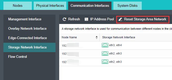 As shown in the figure below, click Reset Storage Area Network, and adjust the storage communication interface.