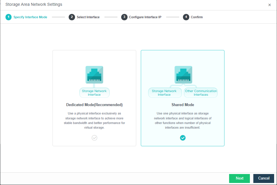 Select Shared Mode. Click Next, select the aggregation interface with the previously enabled Enable storage network interface sharing. Fill in the planned VLAN ID and interface IP address, and click OK.