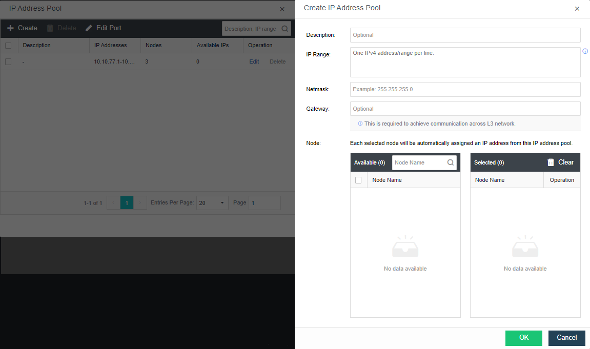 Click Create for the new pool and fill in the planned IP address/netmask.