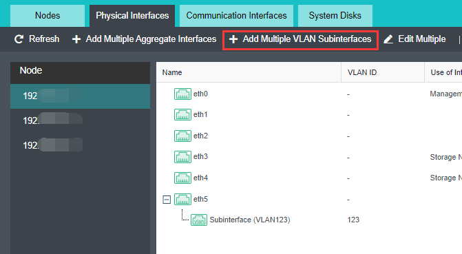 It is recommended to configure VLAN for network isolation in each network plane. VLAN sub-interfaces are configured for management, VXLAN, and storage. VLAN sub interfaces are not supported for service interfaces. Service VLAN can only be configured through the interface group of the virtual network.