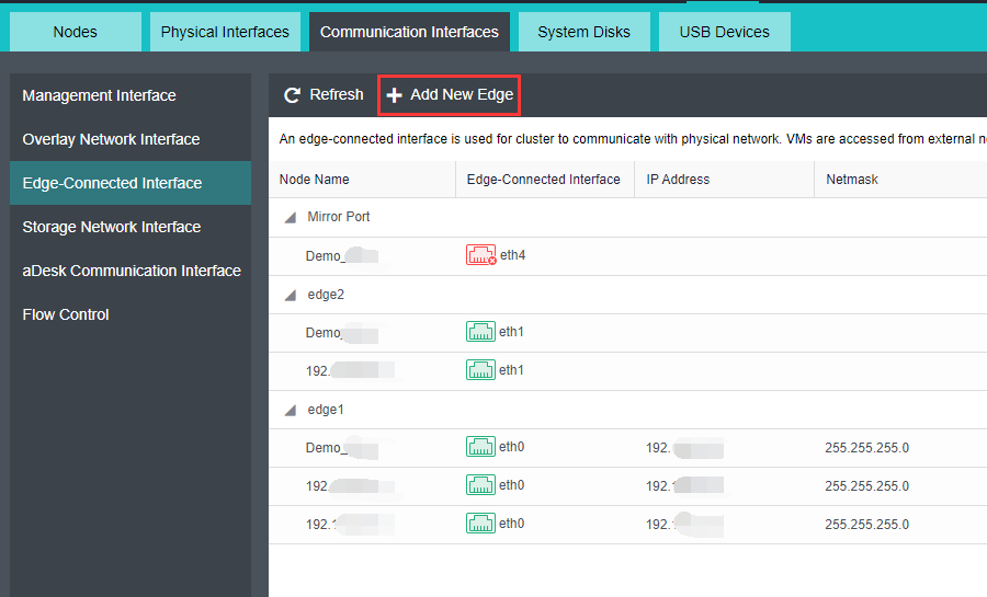 Navigate to Nodes > Communication Interfaces > Edge-Connected Interface. Then, click Add New Edge, select the available network interface for all nodes and click OK to create the Edge.